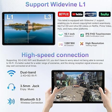 【 HD Eyes Protection Screen and Widevine L1 】This Android tablet features a 10-inch HD display with an high resolution of 1280x800 IPS, which brings you truer colors and clearer images. The tablet supports Widevine L1, allowing you to smoothly watch copyrighted content such as FHD and UHD content on Prime Video, Hulu, and more. It provide the safer, higher-quality viewing experience.