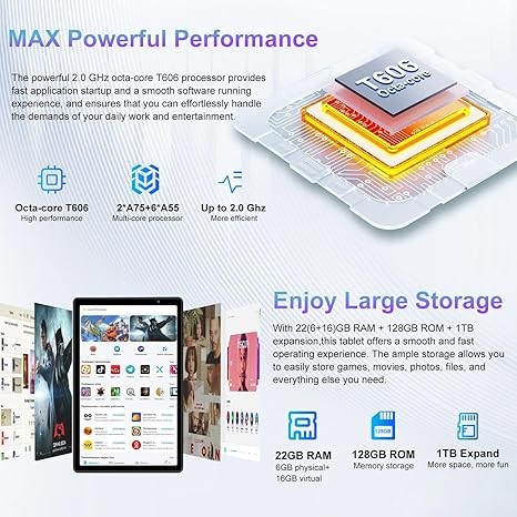 【 22 (6+16)GB RAM + 128GB ROM + 1TB Expansion 】The Tablet comes with 22GB (6GB physical + 16GB virtual) RAM, ensuring a smooth operational experience and faster reading and writing capabilities. It features 128GB of internal storage and supports up to 1TB TF card expansion (not included), which can easily store a variety of games, movies, photos, files, and more.