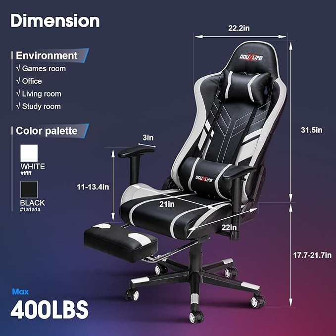 Ergonomic Design for Ultimate Comfort: The Douxlife gaming chair features a detachable headrest, lumbar pillow, and 33-inch high backrest for maximum support. Adjustable 2D armrests move up and down and rotate to fit your arms perfectly