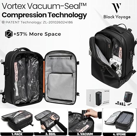 • Space-Saving Vacuum Compression: Maximize your packing efficiency with our advanced vacuum compression technology. Featuring one-way valve chambers, you can either use our electric vacuum pump for quick compression or manually press to release air. Enjoy optimized space and minimize wasted luggage room.