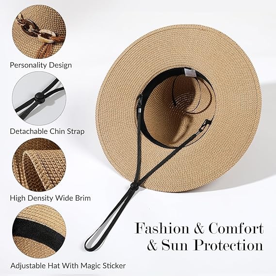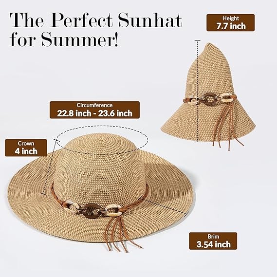 • ? One Size Fit Most Women - US Size: 71/4 - 71/2. Head Measurements:23 - 24 inches,brim Measurements: 3.54 inches, depth Measurements: 4 inches. You can adjust the size of the hat through the adjust band inside in the hat. The straw sun hat with chin strap provides extra protection during windy days.You can adjust the size of the hat through the adjust band inside in the hat. The straw sun hat with chin strap provides extra protection during windy days.