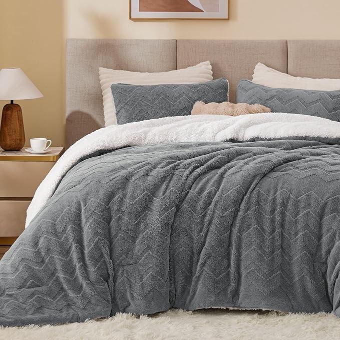 BEDELITE Fluffy Queen Comforter Set - Super Soft Sherpa Grey Comforter for Queen Size Bed, Luxury Warm Bedding Set for Winter, Fuzzy Bed Set 3 Pieces (1 Comforter, 2 Pillowcases)