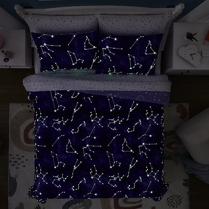 • 【Glow in the Dark Design】The stars pattern can glow in the dark, creating a marvellous sleeping environment for kids. The luminous comforter and sham enable kid to feel safer at night. This galaxy comforter set will be a wonderful idea for kids to decorate the bedrooms.