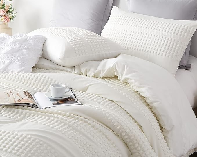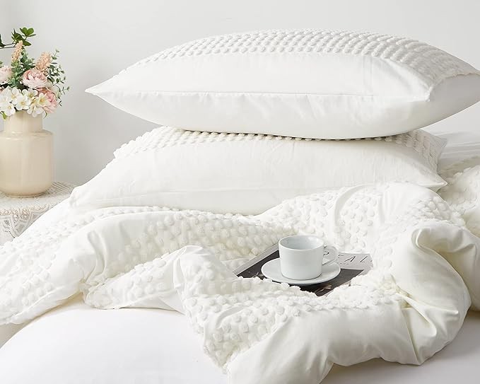 Cupocupa King Size Comforter Set;White Boho Tufted Lightweight Bedding Sets 3PCS Soft Jacquard Pom Pom Comforter with 2 Pillow Cases for All Season