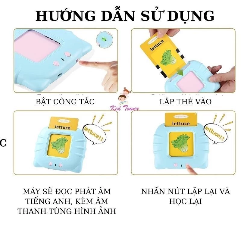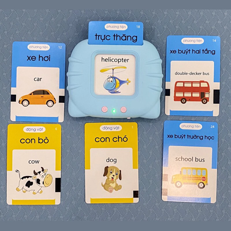 1. Đồ Chơi Máy Đọc Thẻ Từ Vựng Song Ngữ Cho Bé VINATOYS, Máy Đọc Thẻ Flashcard 112 Thẻ Âm Thanh To Sắc Nét Sử Dụng Sạc USB * Thông tin sản phẩm - 3 chế độ đọc: Có thể cài đặt 3 chế độ đọc tùy nhu cầu: ĐỌC RIÊNG TIẾNG ANH/ ĐỌC RIÊNG TIẾNG VIỆT/ ĐỌC ĐỒNG THỜI 2 NGÔN NGỮ ANH - VIỆT - Loại gồm: 112 thẻ 224 từ vựng - Màu sắc: Xanh, Hồng - Bộ đầy đủ gồm: máy + thẻ + dây sạc 2. Đồ Chơi Máy Đọc Thẻ Từ Vựng Song Ngữ Cho Bé VINATOYS, Máy Đọc Thẻ Flashcard 112 Thẻ Âm Thanh To Sắc Nét Sử Dụng Sạc USB ***** Hướng Dẫn Sử Dụng ***** - (1) Bật/Tắt: Nhấn giữ nút nguồn trong 2 giây để bật máy. Nếu trong 5 phút không hoạt động, máy sẽ tự tắt - (2) Nghe lại: Nhấn nút mũi tên xoay tròn để nghe lại khi thẻ được lắp vào - (3) Âm lượng: Nhấn biển tượng loa để tăng/giảm âm lượng - (4) Sạc pin: Chân sạc micro usb (tặng kèm), khi sạc máy hiện đèn đỏ và đèn sẽ tắt khi pin đầy - (5) Ngôn ngữ: Nhấn giữ đồng thời nút lặp lại và nút âm lượng cho đến khi có tiếng tít nhỏ là ngôn ngữ được chuyển đổi. Máy có thể đọc song ngữ, riêng tiếng anh hoặc riêng tiếng việt - (6) Âm nhạc: Nhấn giữ nút âm lượng hơn 4 giây để phát nhạc 3. Đồ Chơi Máy Đọc Thẻ Từ Vựng Song Ngữ Cho Bé VINATOYS, Máy Đọc Thẻ Flashcard 112 Thẻ Âm Thanh To Sắc Nét Sử Dụng Sạc USB - THƯƠNG HIỆU ĐỒ CHƠI VINATOYS CAM KẾT: + Hình ảnh sản phẩm giống 100%. + Chất lượng sản phẩm tốt 100%. + Sản phẩm được kiểm tra kĩ càng, nghiêm ngặt trước khi giao hàng. + Sản phẩm luôn có sẵn trong kho hàng. + Giao hàng ngay khi nhận được đơn hàng. + Hoàn tiền ngay nếu sản phẩm không giống với mô tả. + Giao hàng toàn quốc, nhận hàng thanh toán. + Hỗ trợ đổi trả theo chính sách của Shopee Mall (nếu do lỗi từ nhà sản xuất) + Tư vấn và giải đáp mọi thắc mắc của khách hàng liên quan đến sản phẩm