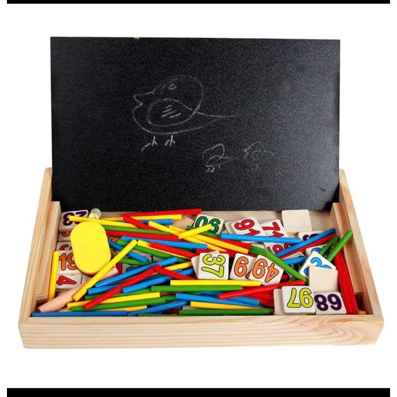 1. Đồ Chơi Toán Học Kèm Bảng Viết 2 Mặt Cho Bé VINATOYS, Bộ Que Tính Và 100 Số Gỗ, Đồ Chơi Trí Tuệ, Thông Minh Bộ đồ chơi toán học thông minh cho bé Bộ đồ chơi toán học thông minh cho bé Giúp bé có thể nhận biết thời gian, học đếm, đọc các số, nhận biết các màu, học các phép tính toán đơn giản, giúp bé phát triển não bộ cũng như khả năng tư duy. - Chất liệu sản phẩm: gỗ thông cao cấp - Kích thước của hộp: 19.4 x 18.5 x 3.9 cm - Trong hộp sản phẩm gồm: - Các chữ số từ 1 tới 100 - Mặt bảng trước dể ghép các số tạo thành những phép tính - 1 chiếc đồng hồ để các phụ huynh dạy bé xem giờ - Que tính với nhiều màu sắc khác nhau, mặt bảng sau để bé có thể vẽ trên đó, giẻ lau, phấn viết không bụi. 2. Đồ Chơi Toán Học Kèm Bảng Viết 2 Mặt Cho Bé VINATOYS, Bộ Que Tính Và 100 Số Gỗ, Đồ Chơi Trí Tuệ, Thông Minh - THƯƠNG HIỆU ĐỒ CHƠI VINATOYS CAM KẾT: + Hình ảnh sản phẩm giống 100%. + Chất lượng sản phẩm tốt 100%. + Sản phẩm được kiểm tra kĩ càng, nghiêm ngặt trước khi giao hàng. + Sản phẩm luôn có sẵn trong kho hàng. + Giao hàng ngay khi nhận được đơn hàng. + Hoàn tiền ngay nếu sản phẩm không giống với mô tả. + Giao hàng toàn quốc, nhận hàng thanh toán. + Hỗ trợ đổi trả theo chính sách của Shopee Mall (nếu do lỗi từ nhà sản xuất) + Tư vấn và giải đáp mọi thắc mắc của khách hàng liên quan đến sản phẩm