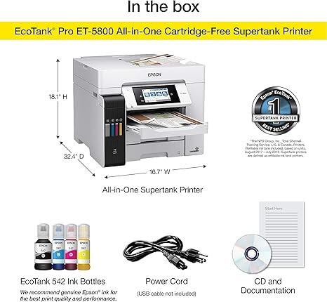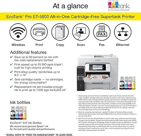 • Stay on top of your office workload with help from the Epson EcoTank Pro ET-5800 Wireless Color Inkjet All-In-One Printer. Print up to 25 pages per minute to accomplish large jobs at high speeds. Wireless connectivity allows you to print from virtually anywhere in the office.