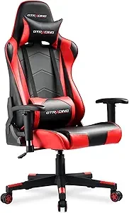 • This GTRACING gaming chair is wrapped in black leatherette and carbonfiber in a sleek, race-inspired shape, providing immersive gaming experience.