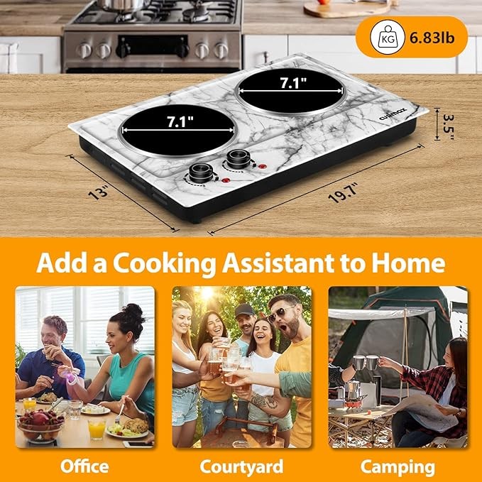 Hot Plate, CUSIMAX Double Burner Electric Hot Plate for Cooking, 1800W Dual Control Portable Electric Stove Countertop Electric Burner Infrared Electric Cooktop, Stainless Steel White Marble