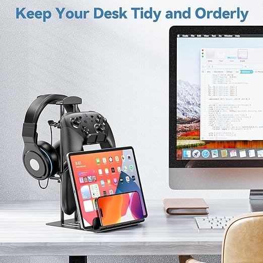 【Universal Compatibility】This controller holder is suitable for vertical placement of various pads, which saves space very well, and up to 2 pads and 1 headphone can be placed. You can put the controller on the stand, and you can also hang headphones and other items. At the same time, the groove of the storage organizer can hold smart phone, Switch.