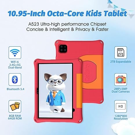 【11 Inch Android 14 Kids Tablet】CALLSKY-NOTE kids tablet is equipped with 10.95 inch 1280x800 IPS display, octa-core processor, 8GB(3+5) RAM and 64GB storage (expandable to 2TB via Micro SD card), plus WiFi 6 and Bluetooth 5.4 connectivity, 2MP+5MP Dual Camera, meeting all learning and entertainment needs. The 11 inch kids tablet runs on Android 14 system, featuring a user-friendly interface and easy-to-use operations