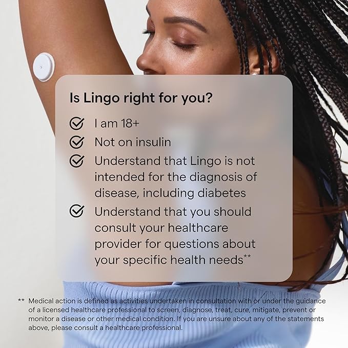 • WHAT'S IN THE PACK: 1 Lingo biosensor lasts up to 14 days+ of minute-by-minute continuous glucose tracking. Full access to the Lingo app and Lingo coaching program to help build habits and adjust your nutrition. Compatible with iPhone US only