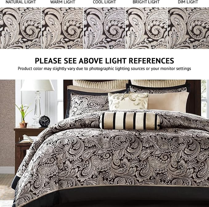 Madison Park Aubrey Cozy Comforter Set, Faux Silk Jacquard Paisley Design - All Season Down Alternative Bedding with Cotton Bed Sheets, Bed Skirt & Toss Pillows, Queen Black 12 Piece