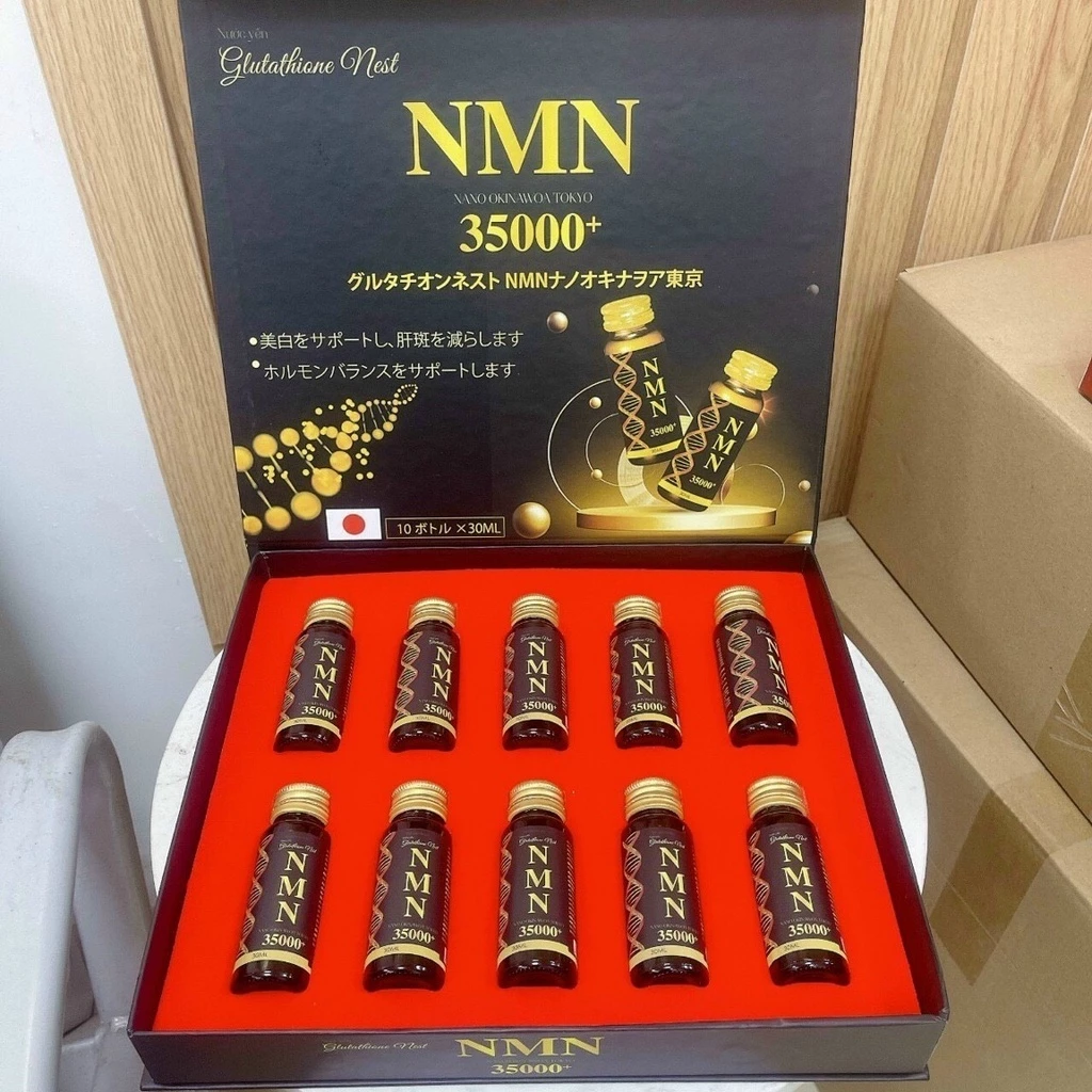Nước Uống Glutathione Nest NMN 35000+Giúp Trắng Da Ngừa Thâm Nám, Trẻ Hóa Da Hộp 10 Chai -COLLAGENnmn * Thành phần: - Bột NMN - Glutathione ( chiết xuất từ nấm men ) - Collagen nano ( chiết xuất từ cá tuyết ) - Vitamin C - Vitamin E - Aloe vera - Chiết xuất táo - Chiết xuất đào - Cúc la mã - Selenium - Phụ liệu: Nước, đường isomalt, nipazil, sorbitol, hương trái cây vừa đủ * Công dụng: - Người có nàn da xấu, nám, tàn nhang, da khô, nhăn, da bị lão hóa, chảy xệ, đen sạm - Người có nhu cầu chăm sóc làn da, muốn làm sáng da, cải thiện sắc tố da, người bị khô da, nhăn da. - Giúp phục hồi, trẻ hóa da, cho làn da trắng sáng, mịn hồng - Người bị nhiễm sắc tố melamin gây đồi mồi da, thâm da do làm việc trong môi trường ô nhiễm, khói bụi, ánh nắng, tia tử ngoại UV, ... - Người cần bổ sung hoạt chất NMN và các vitamin thiết yếu giúp chăm sóc sức khỏe, tái tạo, trẻ hóa làn da từ trong ra ngoài. * Cách dùng: - Ngày 1 lần * 50ml/lần. Uống trước hoặc sau ăn 30 phút - Nên duy trì hàng ngày hoặc ít nhất từ 3-6 tháng. Để sản phẩm đạt hiệu quả rõ ràng. Giúp da mịn màng trắng sáng, giảm lão hóa. * Lưu ý: sản phẩm sử dụng đường cỏ ngọt ( đường không năng lượng ) nên dùng được cho người tiểu đường, cao huyết áp, tim mạch. * Bảo quản nơi khô ráo, thoáng mát, tránh ánh sáng trực tiếp từ mặt trời SHOP CAM KẾT Sản Phẩm Chính Hãng 100% Hoàn Trả Hàng Miến Phí Trong 7 Ngày Nếu Có Lỗi SP Từ Nhà Bán