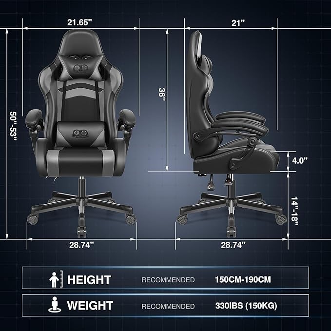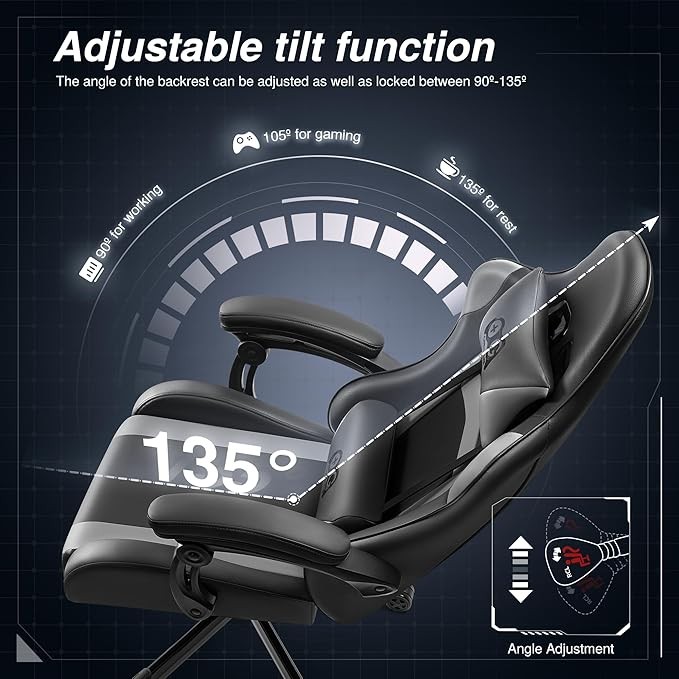 • [Multiple adjustments] The backrest of the gaming chair can be tilted between 90º-135º to ensure your comfort throughout extended work and gaming sessions. Also, the height adjustment function allows you to find the ideal height for both working and gaming.