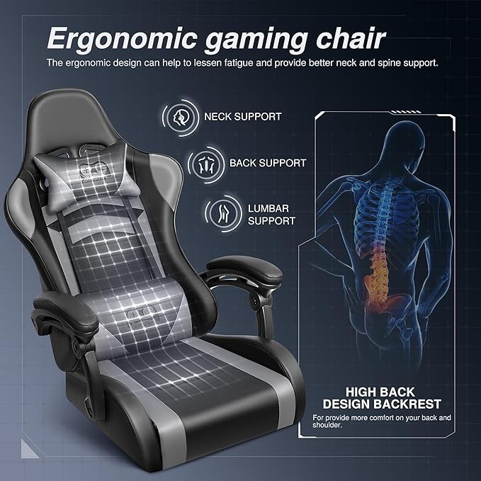 • [Ergonomic design] High-density foam is used as padding in the gaming chair for a more comfortable sitting experience, and it also has a flexible headrest and lumbar pillows to give you excellent neck and back support.