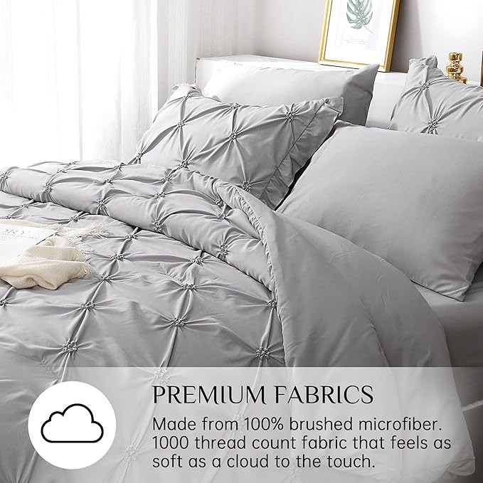 • Elegant Design: Transform your bedroom with the sophisticated pinch pleat design of the JOLLYVOGUE Queen Comforter Set. The pintuck details and ruffled shams add a modern, elegant touch that's perfect for any decor.