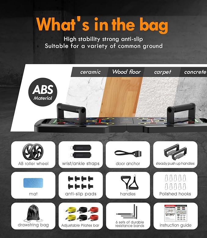 • 【Fitness System for Anyone】Versatile home portable fitness device, We've kept the professional push up straining, Added foldable fitness bars and wrist/ankle straps, Ab roller wheel and 6 resistance bands so You can perform more exercises. Light but stable enough. You can choose the intensity according to your ability.