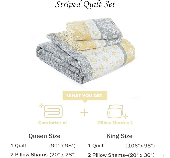 Quilt King Size, Cotton King Size Comforter Set, Yellow Grey White Bedding, Farmhouse Striped Bed Set, Lightweight Bedspread All Seasons 3 Piece