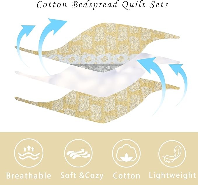 • 【Yellow King Bed Set 】The lightweight quilt set is suitable for four seasons , the reversible quilts in summer or warm weather can be use with a sheet/ blanket underneath. Also, it can be as a bedspread or coverlet to provide warmth over or under your duvet or comforter in cold weather. The cotton quilted bedspread could be suitable for bedroom, kid’s room, guest room, RV and vocation room