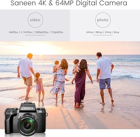 Saneen Digital Camera, 4k Cameras for Photography & Video, 64MP WiFi Touch Screen Vlogging Camera for YouTube with Flash, 32GB Card, Lens Hood, 3000mAH Battery, Front and Rear Cameras - Black