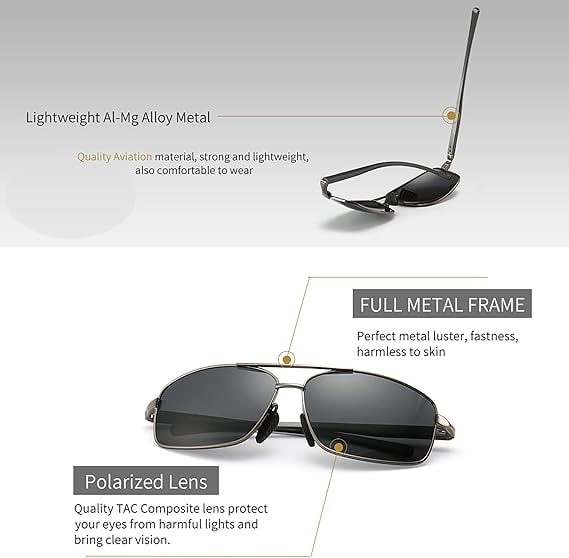 Unbreakable but Comfortable: Aviator sunglasses are crafted from lightweight Al-Mg metal, only 25g, come with spring loaded hinged legs and adjustable silicon nose pads, wearing it for a long time will not cause any discomfort