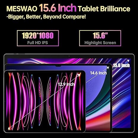 POWERFUL HELIO G99 PROCESSOR:Featuring an advanced MTK G99 core, MESWAO 15.6 Inch tablet guarantees seamless performance across web browsing, video streaming, and gaming. Crafted with a sophisticated 6nm process and a "2 + 6" configuration, it ensures a experience without delay. The Cortex-A76 achieves a peak speed of 2.2 GHz, complemented by the Cortex-A55 operating at 2.0 GHz, delivering unparalleled processing power for optimal efficiency.