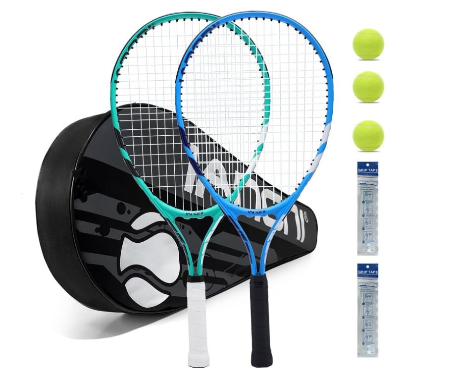 【8 in 1 VALUE PACK】 - the kids tennis racquet set comes with 2x 23" tennis rackets,3x Tennis Balls, 2x Handle Grips and 1x Portable Racket Cover