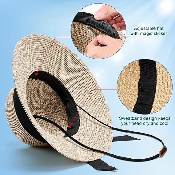 • The sun hat is made of high quality papyrus, which is comfortable and beautiful, and the wide brim design provides you with sun protection on hot summer days, preventing your face and neck from getting sunburned by UV rays.
